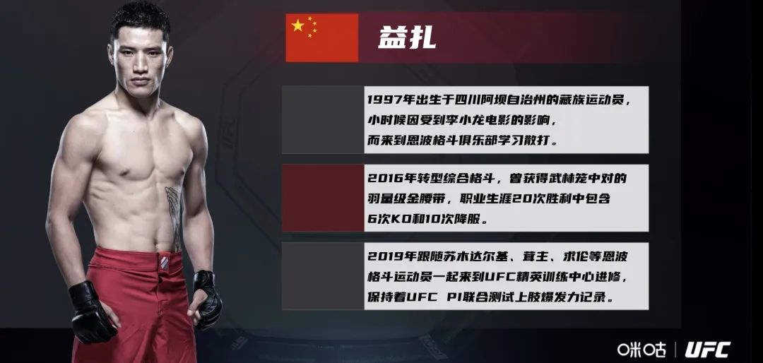 今年25岁的益扎来自四川恩波格斗,是继苏木达尔基之后又一位全面优秀的藏族格斗战士。他本次的对手是来自日本的柔道高手松岛厉,这场比赛益扎表现出色。