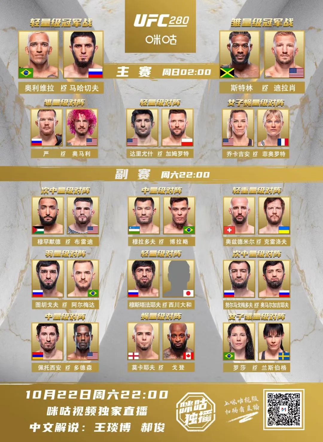 奥利维拉VS马哈切夫、斯特林VS迪拉肖UFC280今晚十点开战,主赛周日凌晨两点“无情”彼得严VS“蜜糖”奥马利对阵比赛时间公布