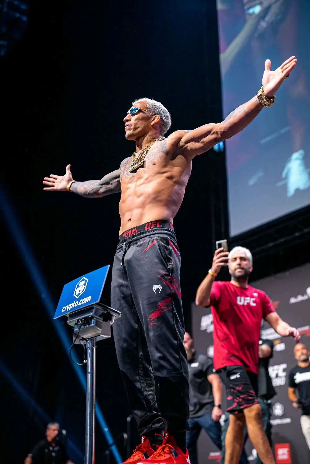 查尔斯-奥利维拉目前战绩为33胜8负1无结果,其中9次KO,21次降服获胜。奥利维拉自2018年6月至今已经打出了11连胜,并且终结了其中的10位对手,保持着UFC历史上终结次数和降服次数最多的纪录。在过去的3场比赛中,奥利维拉连续以TKO和降服战胜了迈克尔-钱德勒(Michael Chandler)、达斯汀-普瓦里尔(Dustin Poirier)以及贾斯汀-盖奇(Justin Gaethje)等一线冠 军级选手,巩固了自己在轻量级的统治级地位。但由于在上一场比赛中体重超标,虽然奥利维拉战胜了盖奇,但却被剥夺了冠 军头衔以示惩罚。